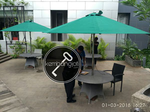 | Keterangan | 3 set meja rotan sintetis dan payung stainless |